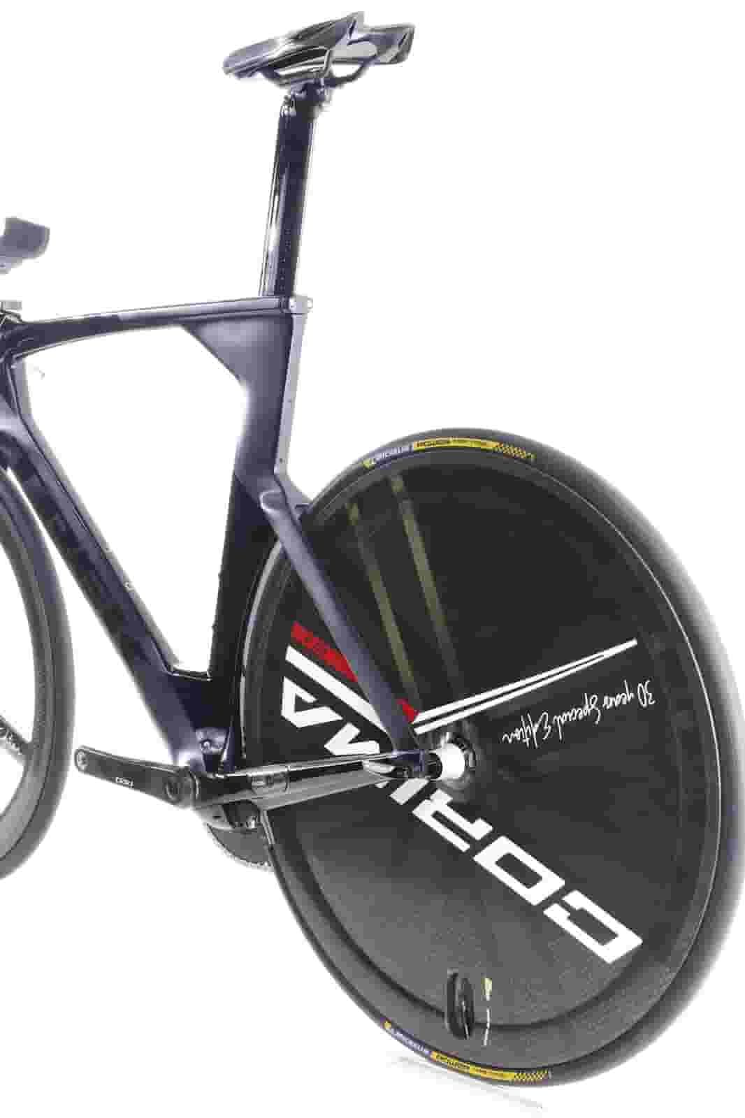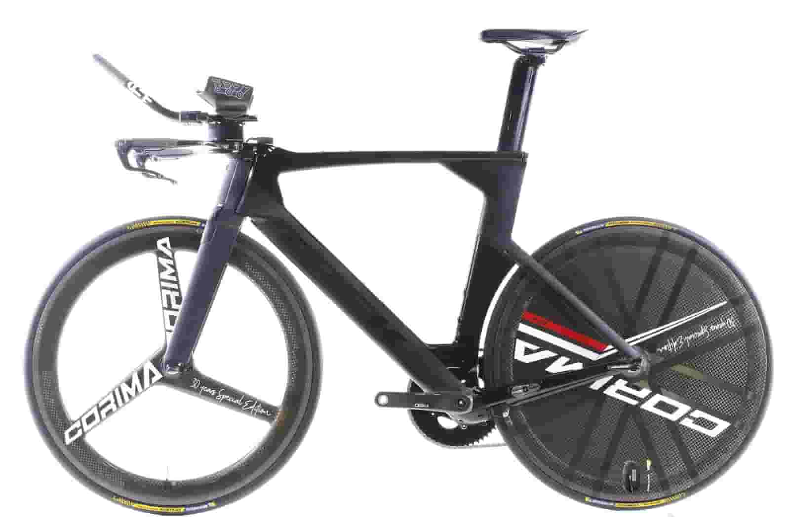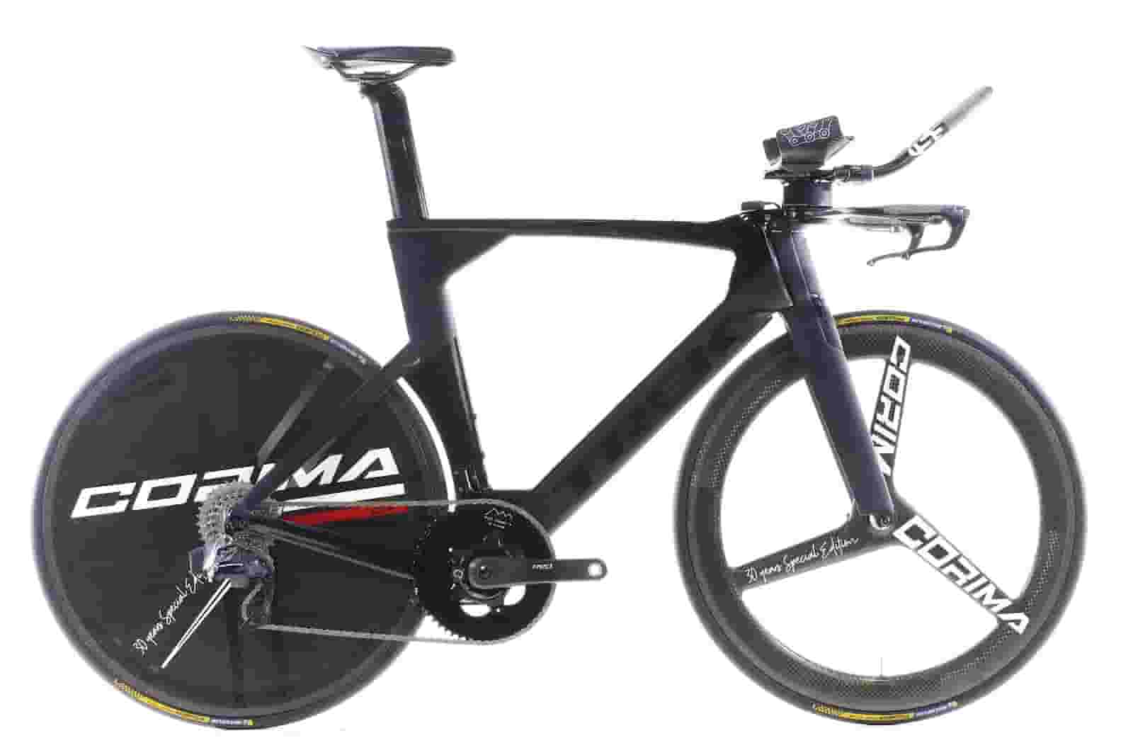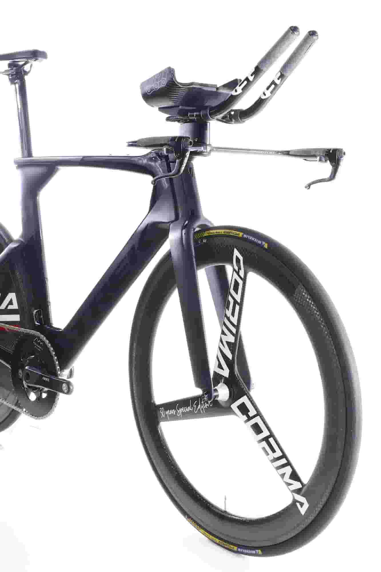 Front wheel: Corima 30 years special edition Tri Spoke, carbon clincher/Rear Wheel: Corima 30 years special edition C+ Carbon DIsc